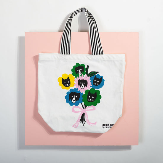 Cat and Dog totes are durable and stylish. Made from canvas with a black & white striped strap - 18" high x 17" wide, we can't think of a more iconic duo! These friends will come with you to the beach, the dog park, your favorite market, or a sweet catch up at the local cafe.